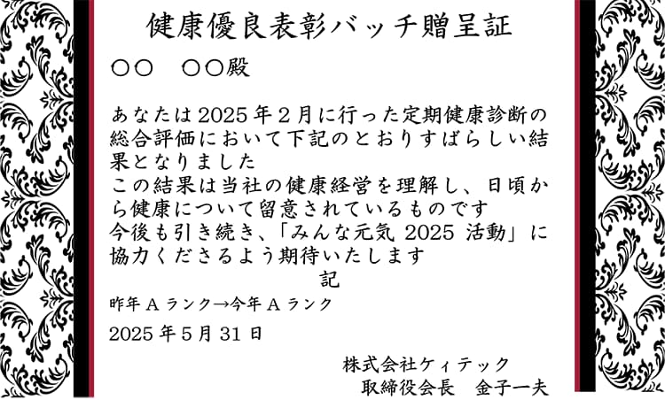 「心身共に豊かな社会を実現」(社是の一部)を目指し、従業員への健康投資を行うことは従業員の活力向上につながるものと期待するものです。
