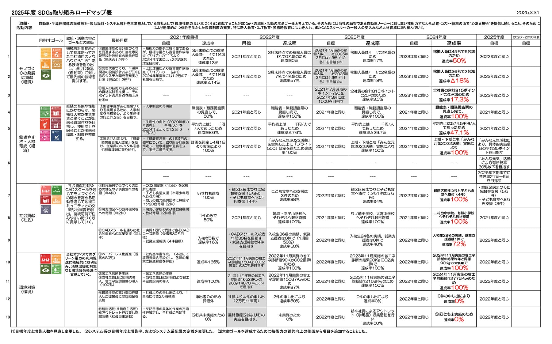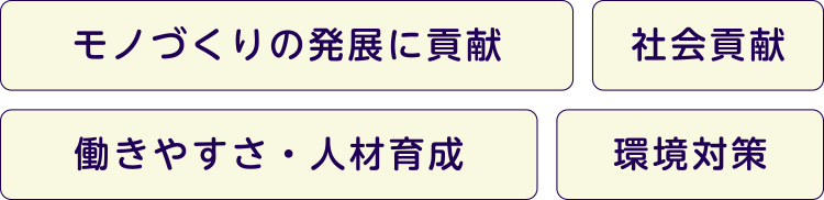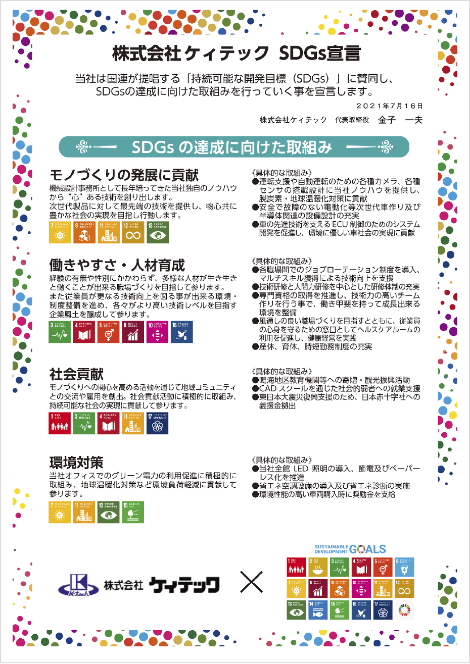 2021年7月に「ケィテック SDGs 宣言書」を作成し、今日に至るまでこの宣言書に基づいて、モノづくりの発展に貢献し、働きやすさ・人材育成・社会貢献・環境対策の4カテゴリーついてに取り組んでまいりました。