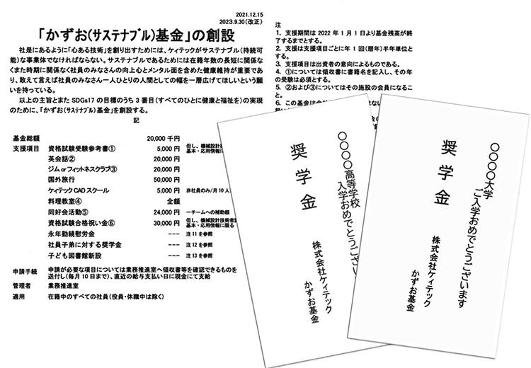 2022年1月より「かずお基金」を創設しました。この基金は社員一人ひとりの人間としての幅を一層広げ、自己啓発を目指すために必要な費用の一部を拠出し、応援するものです。支援項目は資格試験取得のための受験参考書購入、英会話教室、ジムorフィットネスクラブ入会、海外旅行、同好会活動費、資格試験合格祝い金、永年勤続慰労金、社員子弟に対する奨学金などです。
