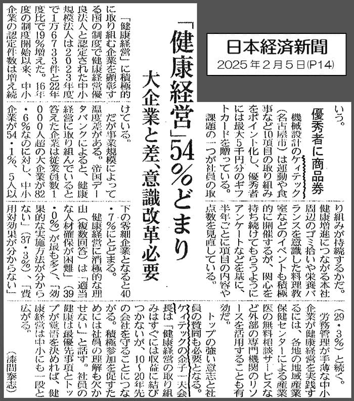 日本経済新聞朝刊(P14)に当社の健康経営が紹介され、特に当社が取組んでいる「みんな元気活動」および料理教室等健康イベントが記載され、多方面から反響を呼んだ。