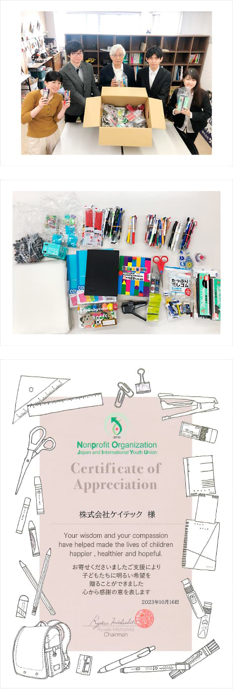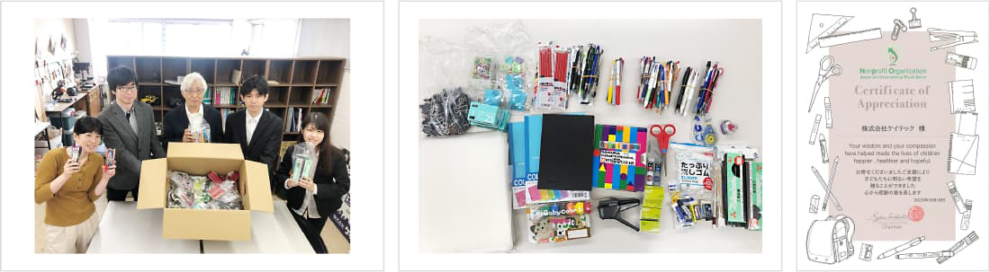 ケィテック社員やそのご家族が使わなくなった文房具を会社が回収し、再利用できる国に輸出する活動に参加しております。